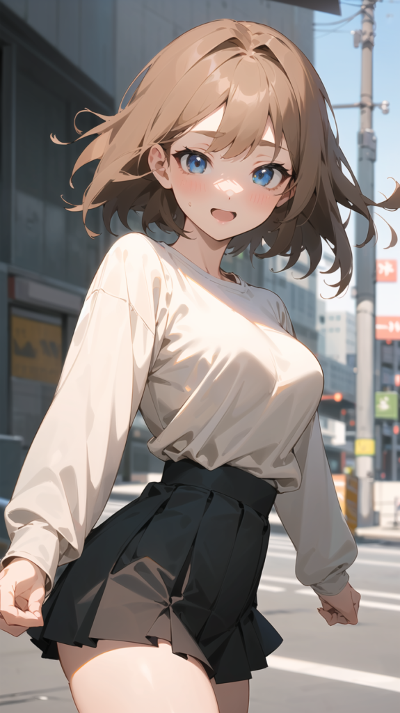 best quality, high res,extremely beautiful detailed anime,detailed eyes,beautiful face,1girl,^_^,(cowboy shot),hand on hip,street,black high Waist Pleated Skirt,(slack,oversize long sleeve plain T-Shirt:1.3),light brown medium hair